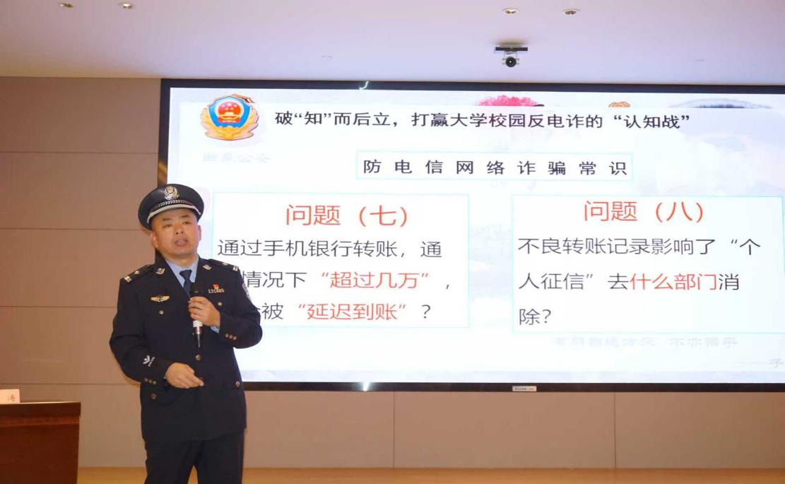 陈延龙在《莫让诈骗斩断飞翔的翅膀》主题报告中重点围绕什么是电信诈骗、电信诈骗的主要目标、电信诈骗的行为特点、电信诈骗为什么容易成功等四个方面做了详细介绍,他对电信诈骗的趋势做了详细分解,使同学们从理论层面深刻了解了各种骗术的逻辑。孔涛在《破“知”而后立,打赢大学校园反电诈的“认知战”》主题报告中,从理论到行动,全面结合发生在我们身边的真实案例讲述如何预防电诈的技巧,并向同学们传授了他亲自编写的防范诈骗“三字经”。